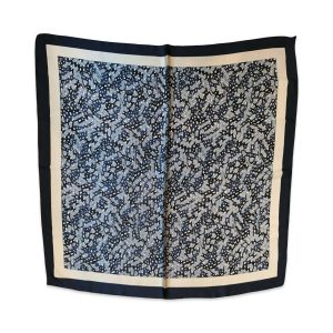 Pañoleta azul con flores blancas, marrones y negras